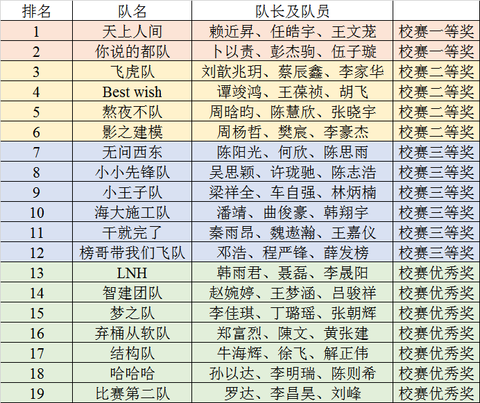 经过协会指导教师对19支参赛队伍的作品和答题进行评审和打分,各参赛队成绩公示如下: