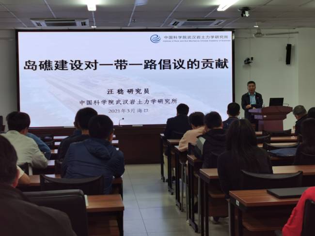 汪稔研究员作了题为“岛礁建设对“一带一路”倡议的贡献”的报告,他分别从工程背景、南海大规模珊瑚礁工程建设、世界范围内珊瑚工程等方面并结合自己从事珊瑚礁工程建设30余年,分享自己团队的研究成果。