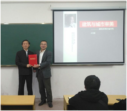 2018年1月8日—1月13日,我院邀请了华中科技大学的余柏椿教授,为2015建筑学专业学生讲授《建筑与城市审美》课程。授课当天学院院长曹宝珠出席开课仪式,并颁发了冬季小学期授课专家聘任证书。余教授现任职务为华中科技大学建筑与城市规划学院教授、博导,城市与景观设计研究中心主任等。主要的研究方向是城市设计、城市景观设计、城市与景观特色、城市发展与城市规划。