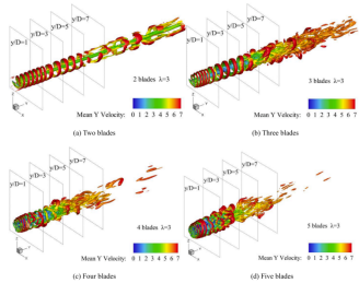 以风能收集效率为目标,研究团体提出了新型的NEFU 6518翼型设计,采用CFD数值模拟发现了三叶片风轮在各项指标上表现出最佳功率系数。在尾流特性方面,叶片数量对尾流宽度、速度分布和涡流结构产生显著影响。随着叶片数量的增加,尾流宽度扩大,速度亏损和湍流强度明显增强,尾流速度的恢复速率显著加快。此外,研究发现尾流中的涡流特性和湍流强度对结构的抗风减振效果具有重要意义。例如,在桥梁等结构工程中布设风机阵列可以利用尾流涡流削弱结构展向涡流效应,从而减小涡激作用,提高结构风致作用稳定性。这一多功能应用将风力发电与工程风效应抑制相结合,拓宽了风力机的使用场景。研究结果不仅为未来风电技术的改进提供了理论依据,还展示了其在新能源利用与工程抗风一体化方面的应用潜力。