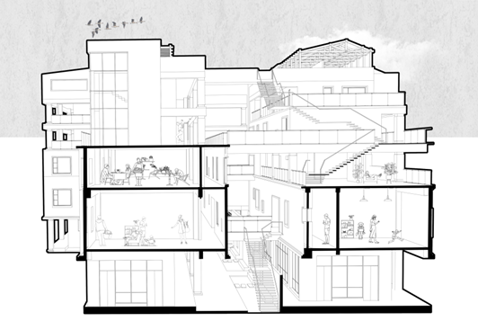 在设计中,从形式、功能、材料三个层面来体现设计主题。形式上保留了天井空间、轴线空间、长筒屋空间、骑楼空间,并将这些元素进行转译,以游历路线串联新旧空间。功能上,保留了居民活动,花卉市场的商业活动等旧功能,创造出公共空间和私密空间组织有序的新功能空间。材料上,立面保留旧墙,维系了场地的记忆和体验感,在此基础上使用新材料改善建筑的通风采光和防晒防潮问题。