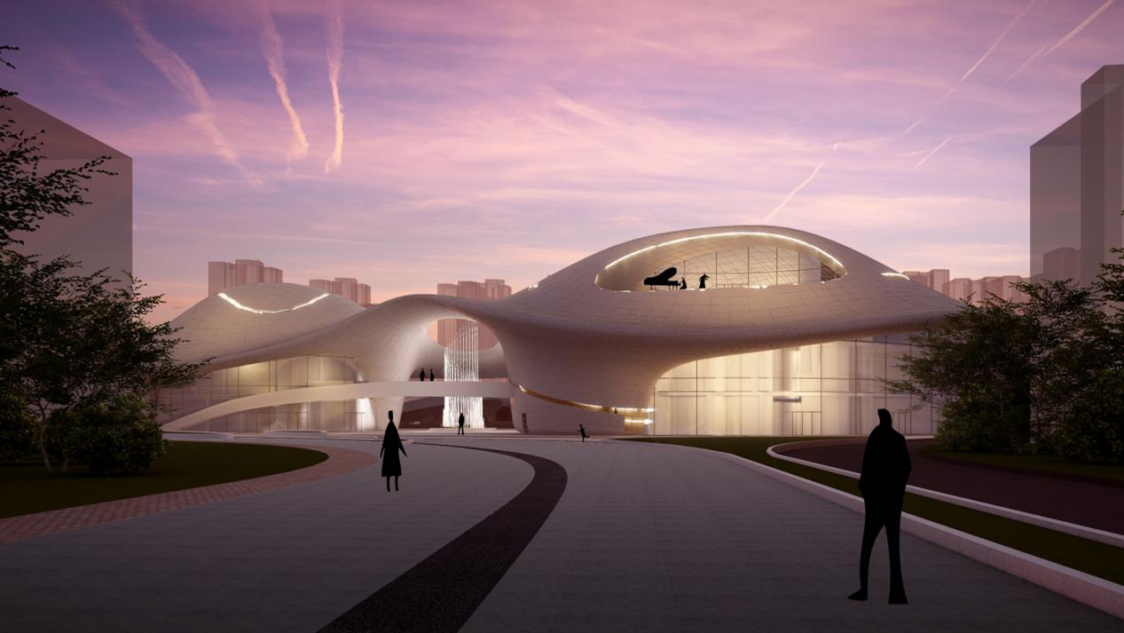 音乐厅像是漂浮在湖上的发光体,它不仅仅是校园名片,更是吸引学生前来活动的场所。这个建筑是一个轻盈通透的发光体,外表皮多用白色,建筑里面的空间除了通高空间还融入绿色庭院,同时建筑周边会设计一个广场来吸引人群,会让夜晚给来往的人们眼前一亮。