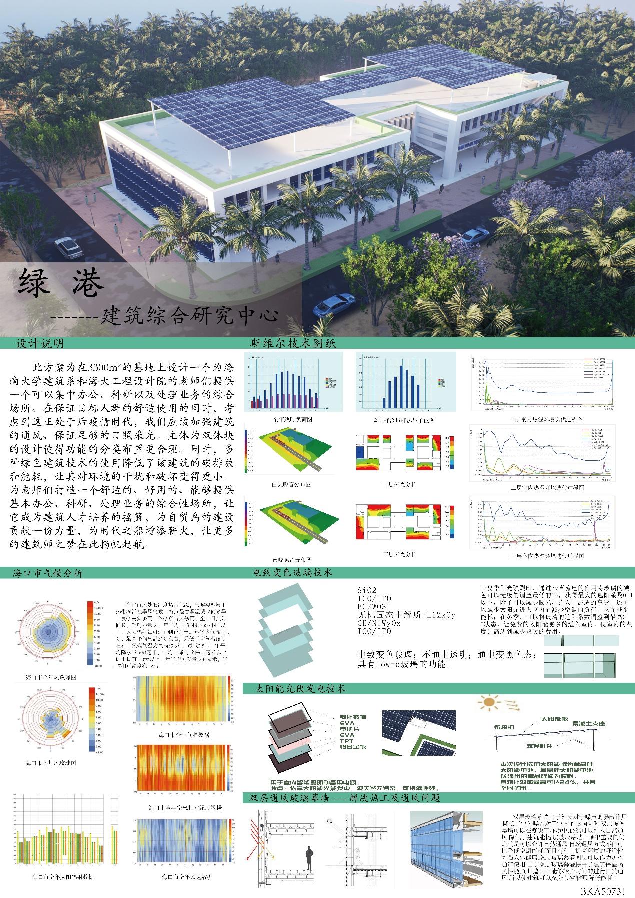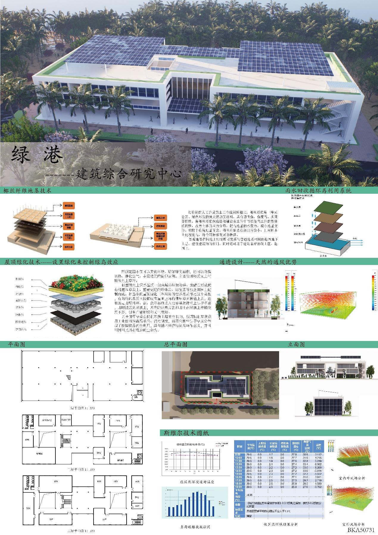 三等奖作品绿港——建筑综合研究中心,此方案是在3300㎡的基地上拟建一个可以为海南大学建筑系和海大工程设计院的老师们提供集中办公、科研以及处理业务的综合场所。在保证目标人群的舒适使用的同时,考虑到这正处于后疫情时代,应该加强建筑的通风、保证足够的日照采光。主体为双体块的设计使得功能的分类布置更合理。同时,多种绿色建筑技术的使用降低了该建筑的碳排放和能耗,让其对环境的干扰和破坏变得更小。为老师们打造一个舒适的、好用的、能够提供基本办公、科研、处理业务的综合性场所,让它成为建筑人才培养的摇篮,为自贸岛的建设贡献一份力量,为时代之船增添薪火,让更多的建筑师之梦在此扬帆起航。