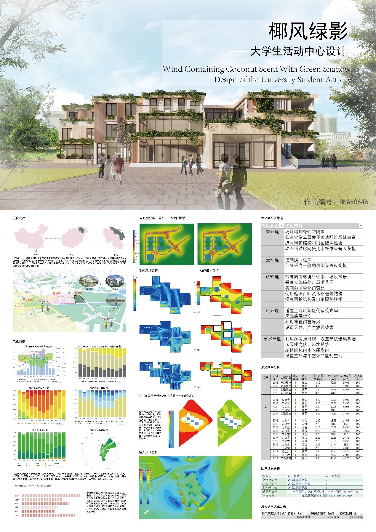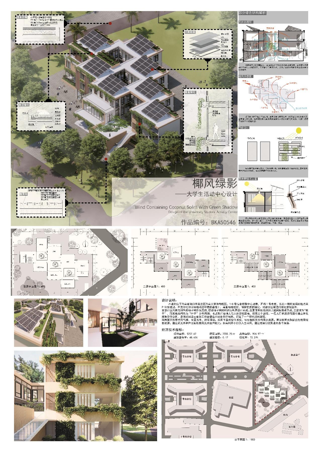优秀作品奖是椰风绿影——大学生活动中心设计,本建筑位于海南省海口市美兰区海南大学海甸校区,1-8号宿舍楼群中心地带,西临1号食堂,东北一侧有宽阔的起点草坪和东坡湖。在充分地分析场地周边环境的基础上,尊重场地现状,保留优质的绿化、对部分区域进行绿化景观提升。