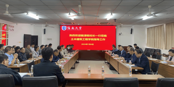 2024年1月4日下午,海南大学校长骆清铭携高佃恭副校长及人事处、基建处、实验室与设备管理处、教务处、发展规划处、科学技术发展院、研究生院等相关职能部门负责人到402cc永利集团进行调研,调研会议在研发楼510室召开,院长周智、党委书记李艳等院领导以及各系办主任、优秀教师代表、教授代表等30余人参加会议,会议由周智院长主持。